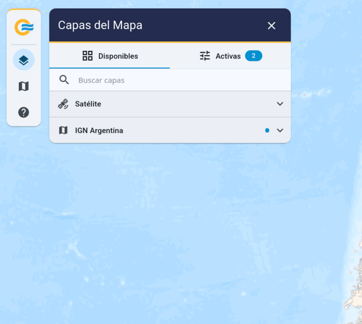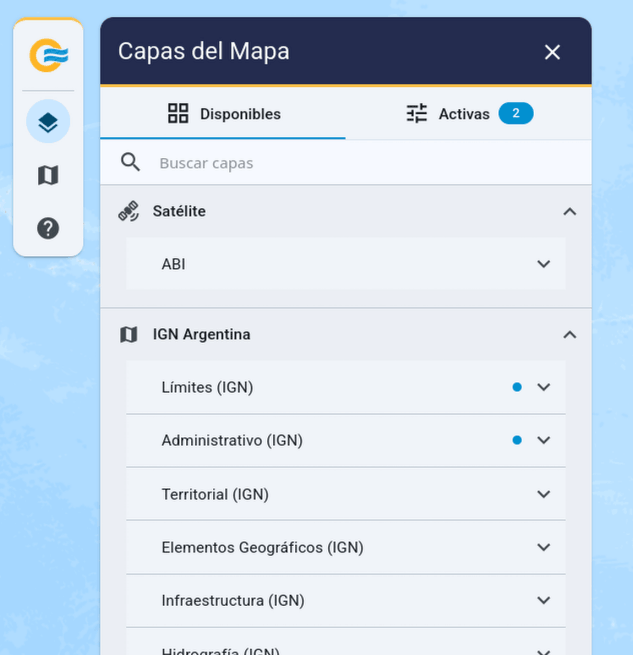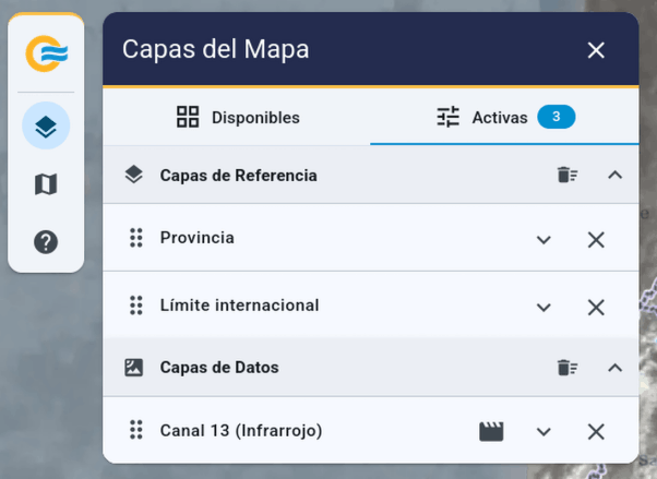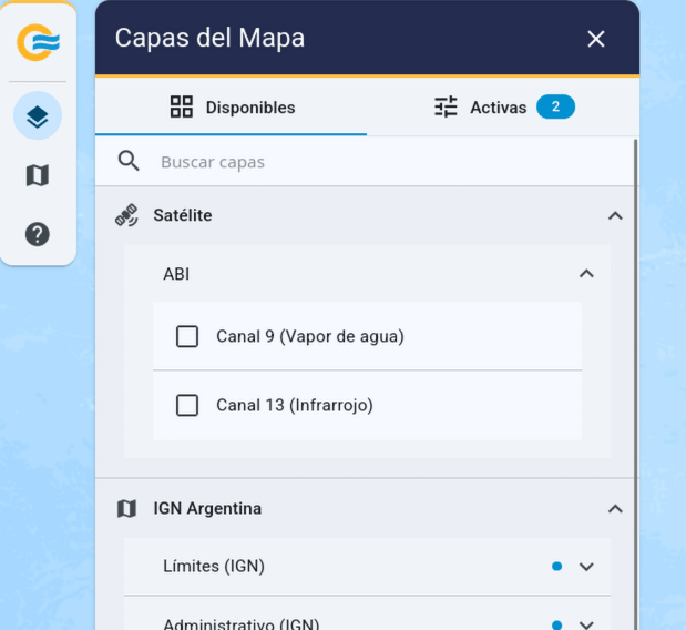 Cuando se selecciona una capa haciendo click en el checkbox se visualiza en el mapa la última imagen disponible de la capa seleccionada y se agrega como "capa activa":