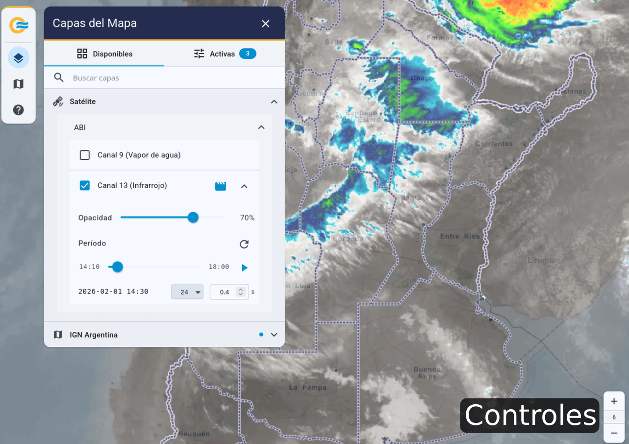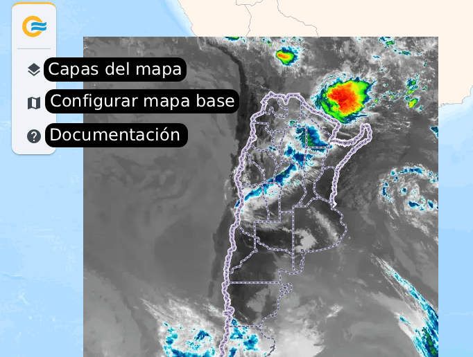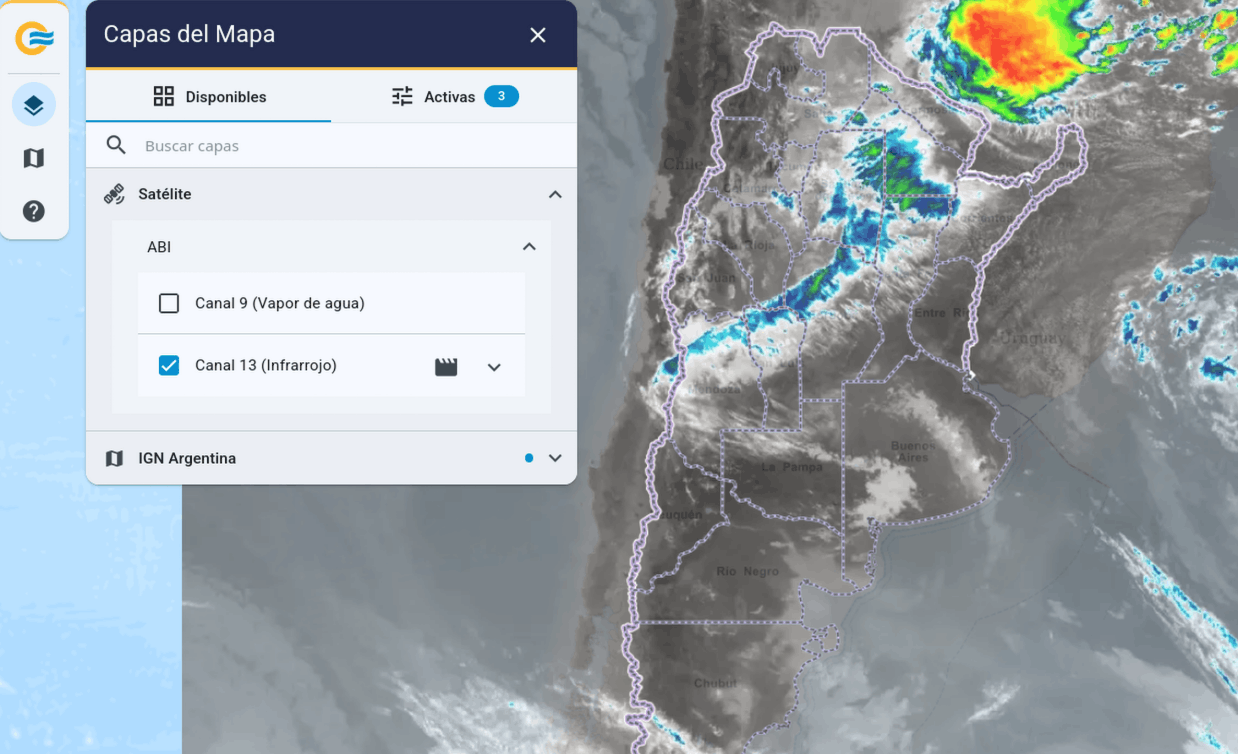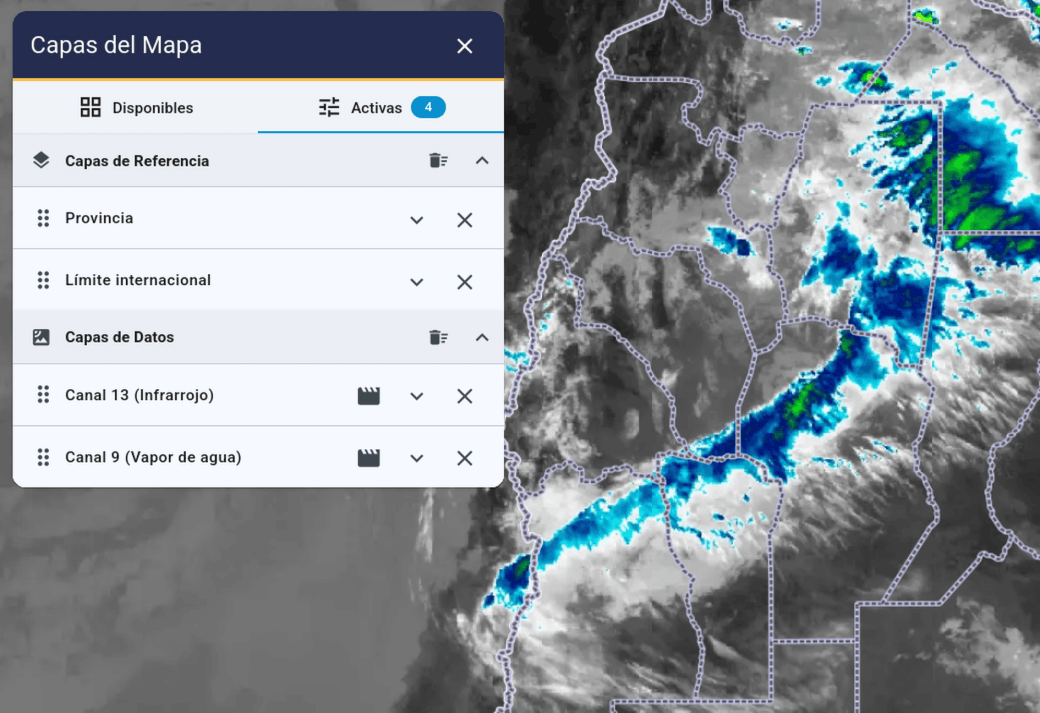 De fondo se encuentra el mapa base, sobre el cual se superponen las capas meteorológicas (ej. Canal 13 ABI del GOES-19) y de referencia (ej. límites de provincias).