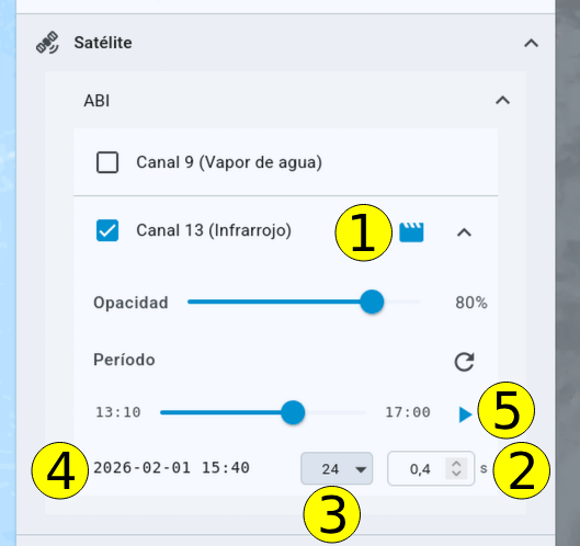Desplegando las configuraciones de una capa recién activada (por ejemplo el Canal 13 del GOES-19) se puede observar la configuración de opacidad de la capa: