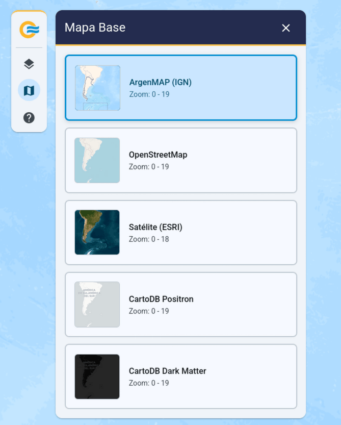 Se puede seleccionar el mapa base que se desea utilizar, por defecto se muestra el mapa del IGN (ArgenMap), entre los siguientes: